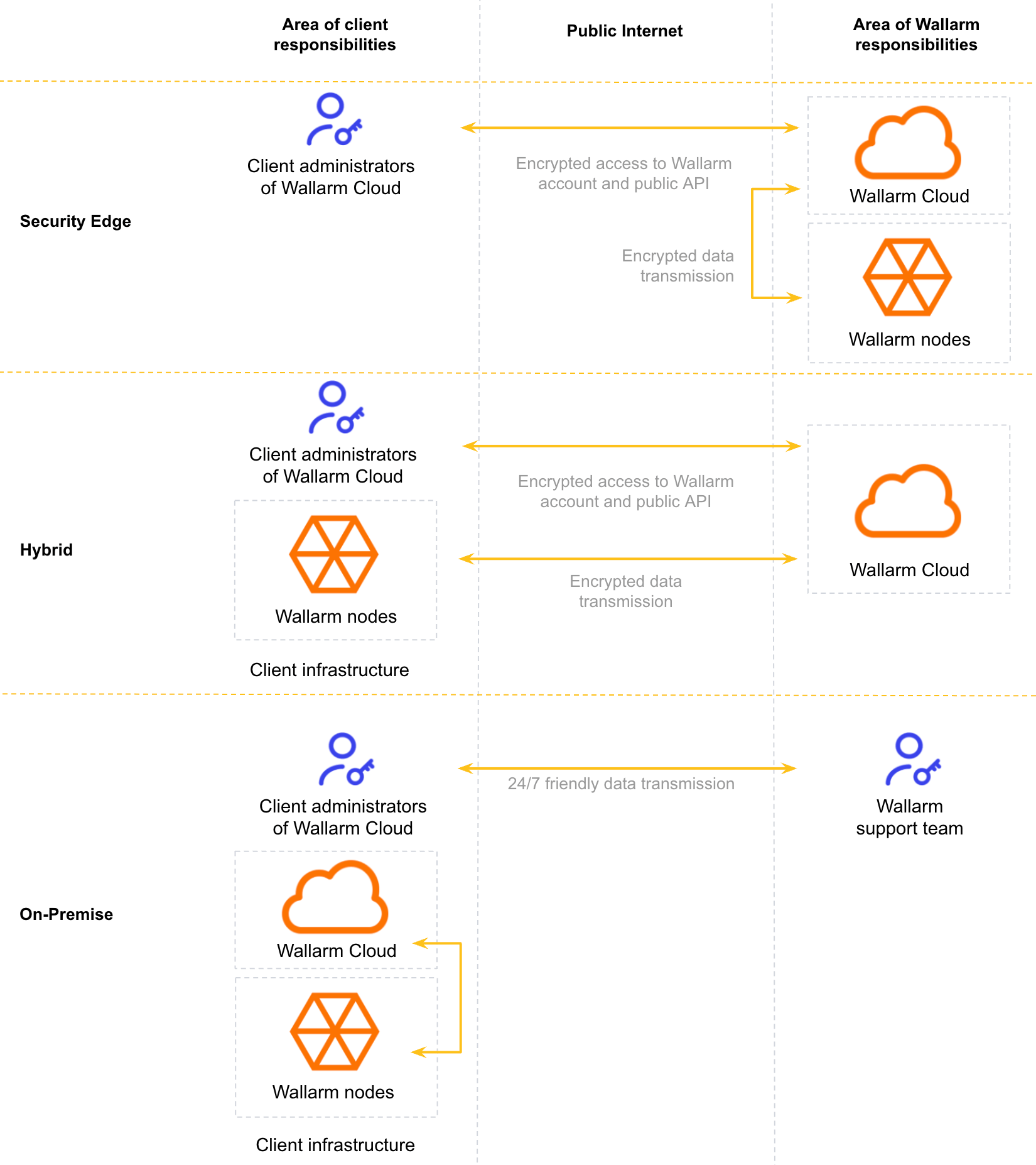 In this deployment form, both Wallarm filtering nodes and Wallarm Cloud components are managed by Wallarm and thus most responsibilities go to Wallarm side.