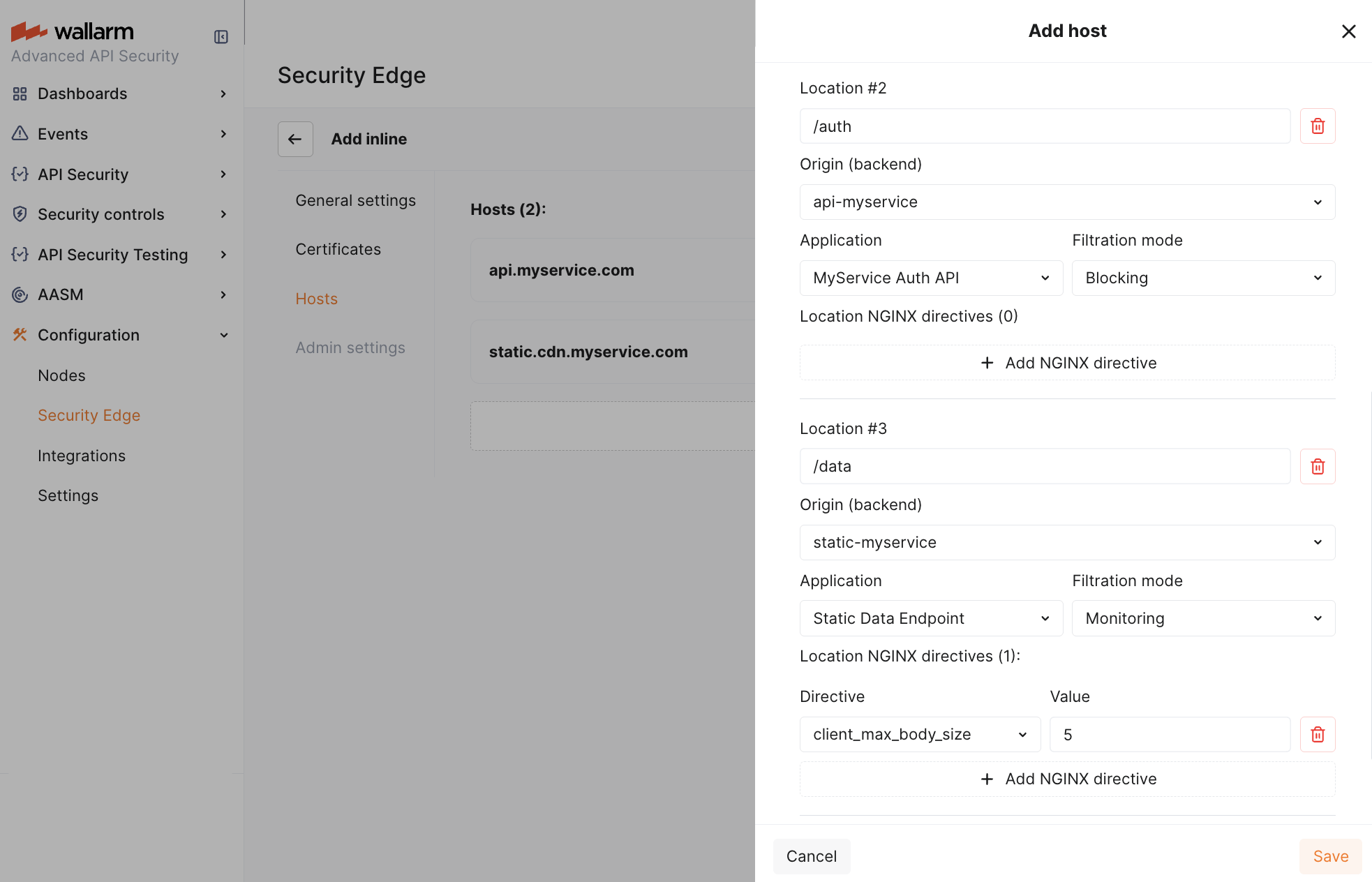 /):- Origin where the Wallarm Node will forward the filtered traffic (if no other location-specific settings are defined). The location's path is automatically appended to the origin.