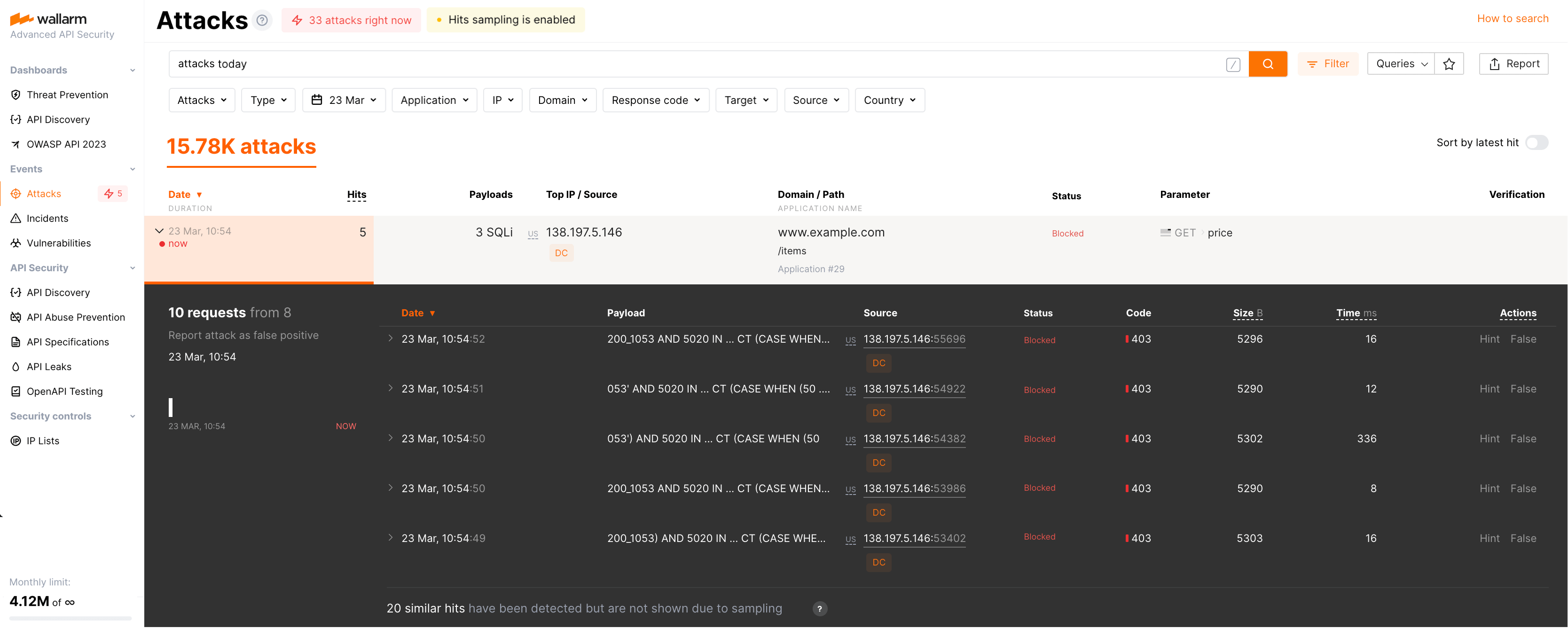 For events from denylisted IPs, sampling is configured on the node side. It uploads only the first 10 identical requests to the Cloud while applying a sampling algorithm to the rest of the hits.