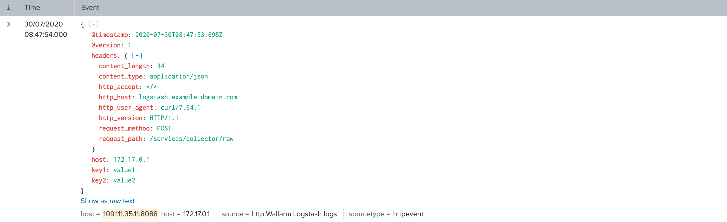 Logstash logs are sent to Splunk HTTP Event Controller with the name Wallarm Logstash logs and other default settings: